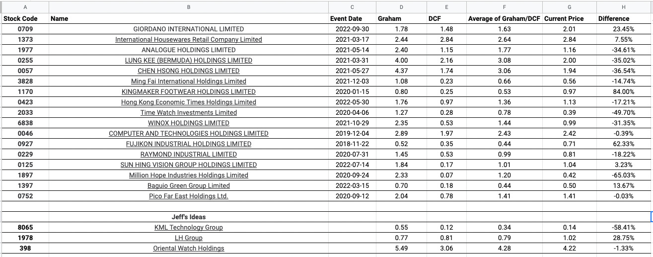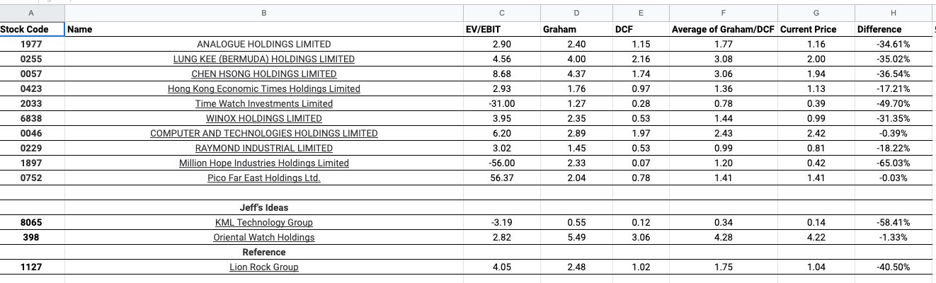 The second valuation will be using a very conservative DCF, using either the average growth from the last 10 years, last 3 years or last 5 years - depending on which is lower, requiring a 15% rate of return and using the 10-year average multiple. Furthermore, I added three stocks that I got from chatting with Jeff. These are KML Technology Group, LH Group and Oriental Watch Group. After doing Graham and DCF valuation, I then take the average and compare them with the current price.