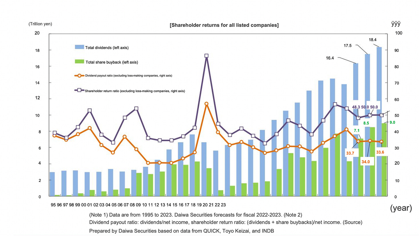 In other news, Japan shareholder returns through dividends and share buyback hit its record high the third year in a row. With improving corporate governance, shareholder returns have improved dramatically. I have added a translated graph, the original is in the link.